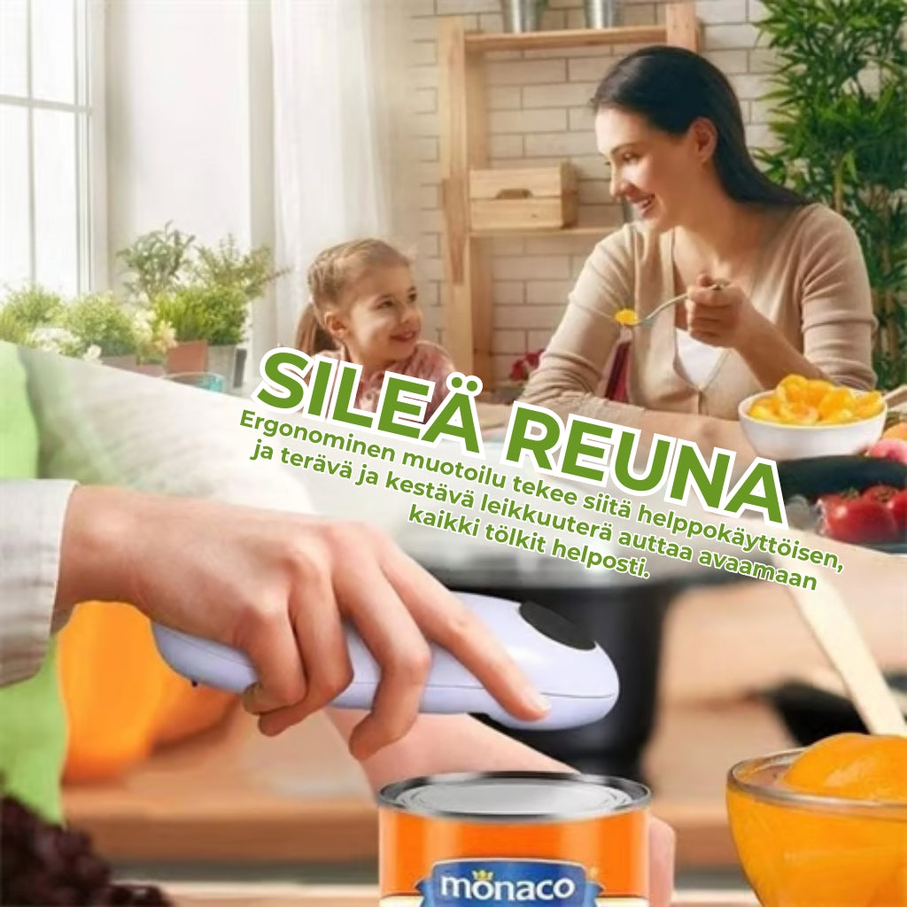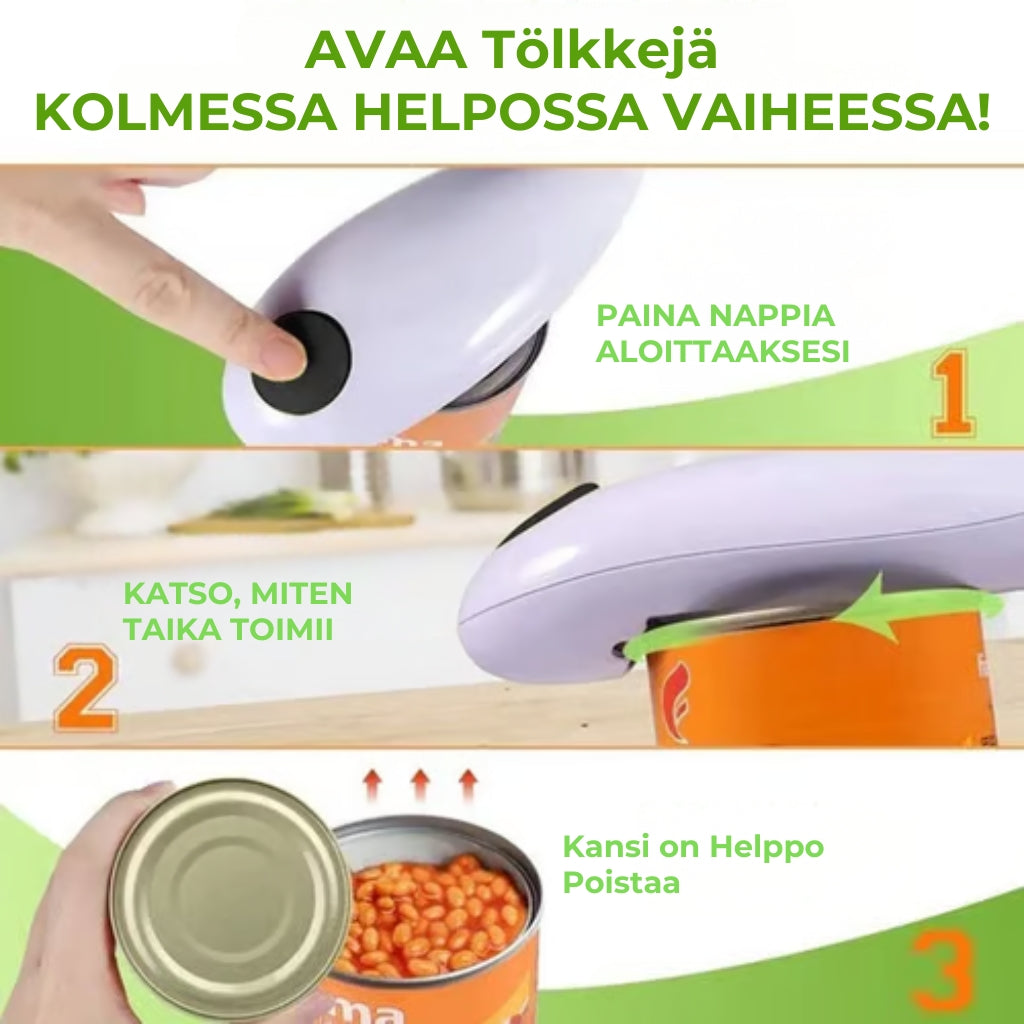 Kaksi painallusta riittÀÀ avaamaan minkÀ tahansa tölkin sÀhköisellÀ tölkinavaajallamme. Paina painiketta kÀynnistÀÀksesi laitteen. Se leikkaa kannen tasaisesti 360°. Paina painiketta uudelleen pysÀyttÀÀksesi.