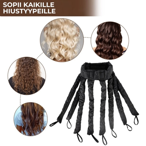 Et tarvitse lainkaan lämpöä! Kahdeksan 38 cm pitkää "lonkeroa" mahdollistavat hiusten täydellisen kietaisun. Kun olet kiinnittänyt hiukset, riittää että odotat hetken – tai nukut sen kanssa yön yli – ja saat kauniit, terveennäköiset kiharat helposti ja nopeasti.