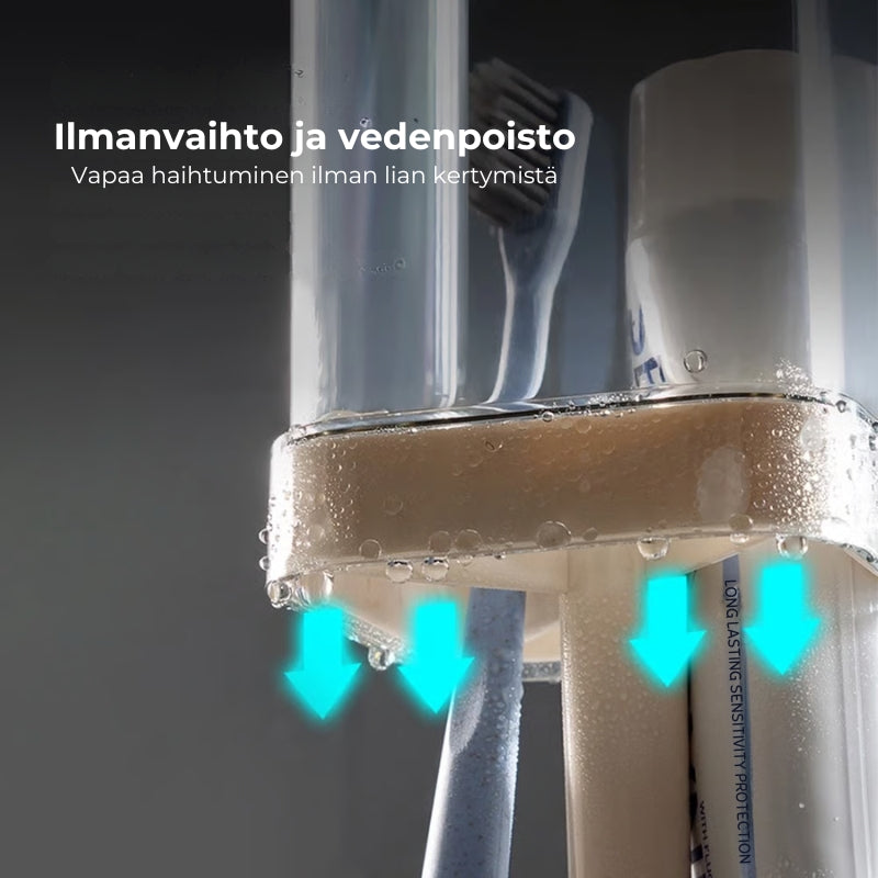 Olipa kyseessä yksi tai useampi hammasharja, tämä teline tarjoaa tilaa eri kokoisille hammasharjoille, manuaalisista sähköisiin. Useiden lokeroiden ansiosta kaikki pysyy siististi erillään ja järjestyksessä, joten jokainen perheenjäsen voi säilyttää oman hammasharjansa turvallisesti.