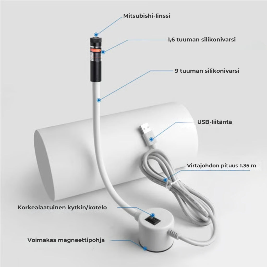 SOVELTUU KAIKKIIN OMPELUKONEISIIN: Laserohjaimessa on magneetti, jonka avulla se on helppo kiinnittää ja irrottaa ompelukoneesta, saumauskoneesta tai kirjontakoneesta. Joustava varsi mahdollistaa laserin sijoittamisen mihin tahansa haluttuun kohtaan.