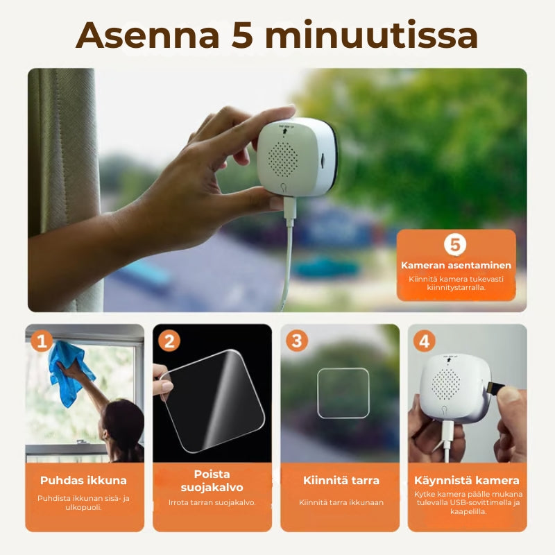 Ei työkaluja, ei vaivaa. Irrota suojakalvo tarrapinnasta, kiinnitä kamera sileälle pinnalle ja liitä USB-kaapeli. Kamera on plug-and-play-tyyppinen ja käyttövalmis muutamassa minuutissa, jopa ensikertalaiselle.