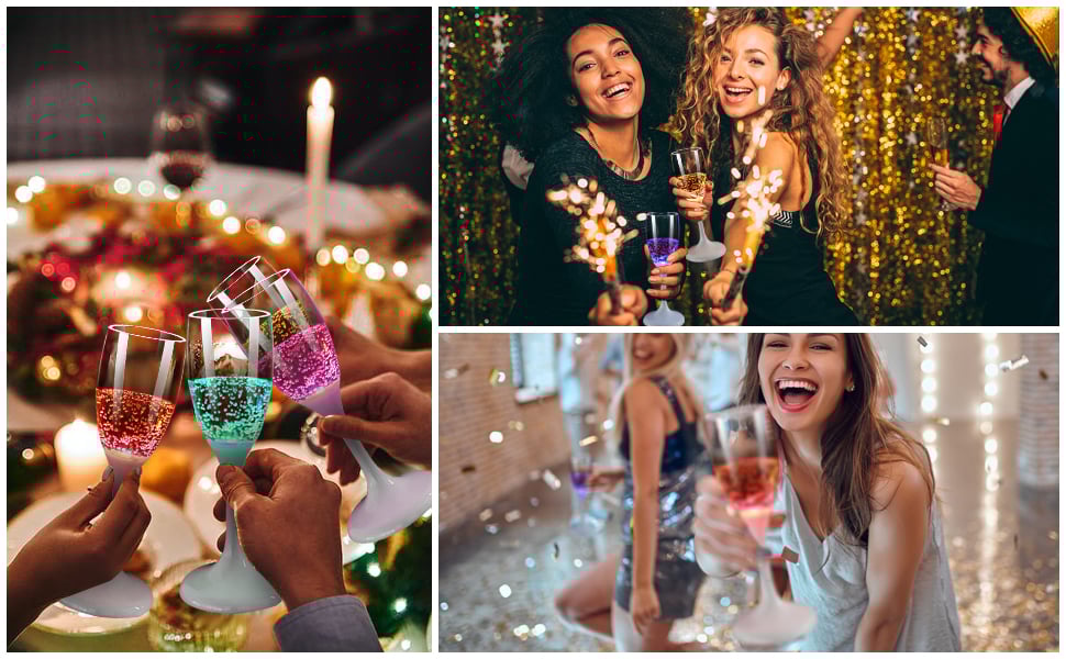 Syttyvät automaattisesti nesteellä – Kun kaadat juoman lasiin, pohjassa oleva LED-valo syttyy automaattisesti ja sammuu, kun lasi tyhjennetään. Samppanjalasin koko: 67 × 183 mm, tilavuus 120 ml/4 oz. Kahdeksankulmaisen juomalasin koko: 82 × 84 mm, tilavuus 250 ml/5 oz.