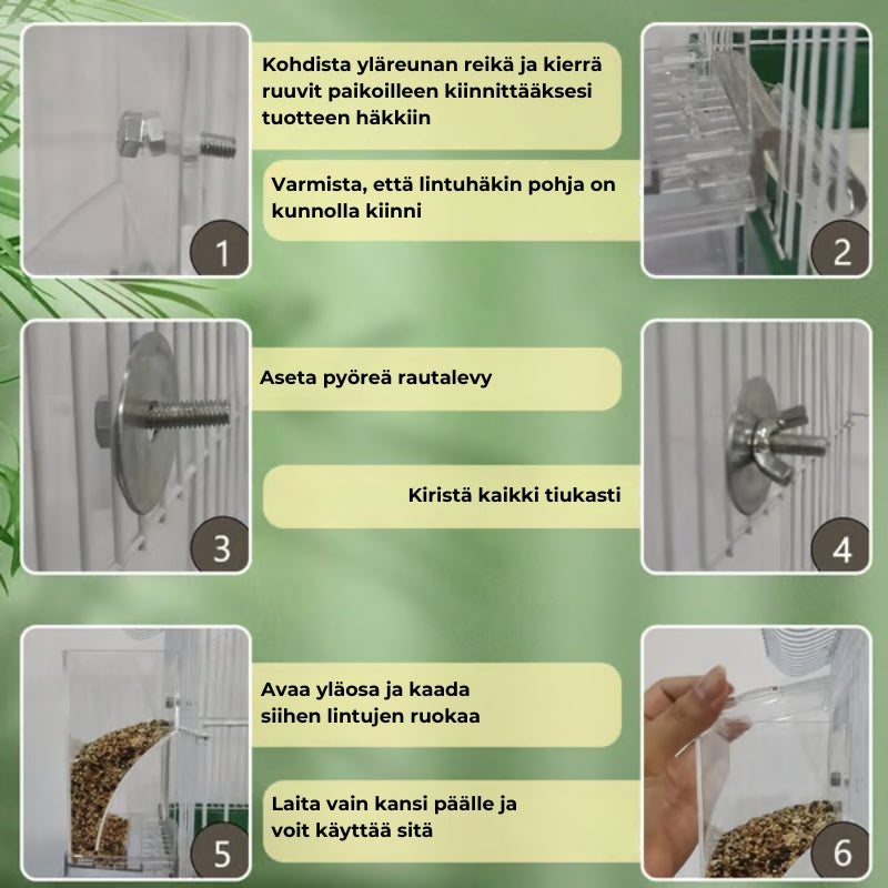 ăHelppo ja kĂ€tevĂ€ asennusă: Laite ei vaadi monimutkaisia asennuksia â kiinnitĂ€ se mukana tulevilla ruuveilla hĂ€kkiin. Ruokintalaatikko voidaan asentaa hĂ€kin sisĂ€- tai ulkopuolelle, ja ruoan lisÀÀminen onnistuu avaamalla kannen â koko laatikkoa ei tarvitse irrottaa.