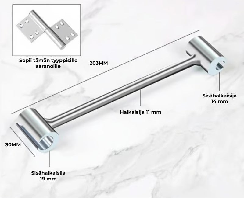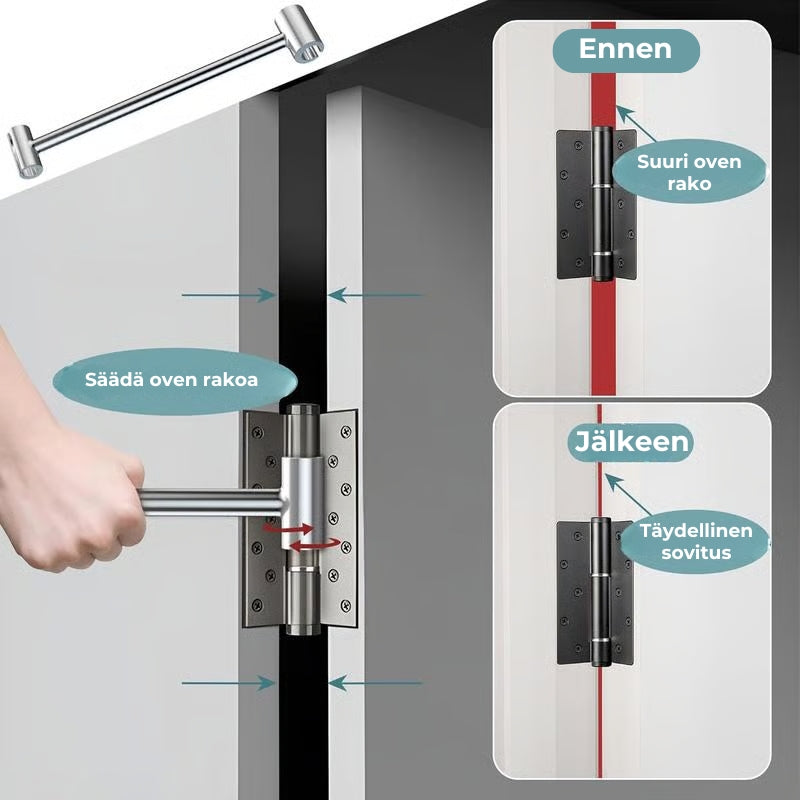 - [Tarkka rakojen säätö] Työkalun avulla voit säätää saranan välystä tarkasti: kääntämällä vasemmalle rakoa voi laajentaa ja kääntämällä oikealle kaventaa. Näin eri ovet ja saranat voidaan kohdistaa täydellisesti, mikä varmistaa ovien sulavan avautumisen ja sulkeutumisen.