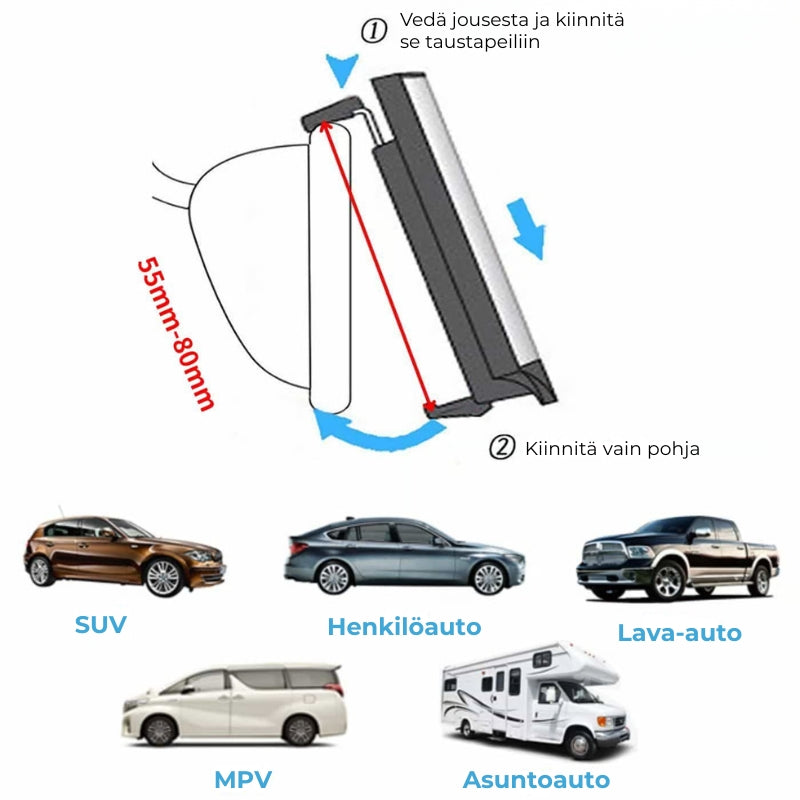 Tämä peili sopii useimpiin vakiomallisiin taustapeileihin, joiden leveys on 55–80 mm. Säädettävien solkien ansiosta se asennetaan noin 10 sekunnissa ilman työkaluja. Peili pysyy tukevasti paikallaan myös epätasaisilla teillä ajaessa.