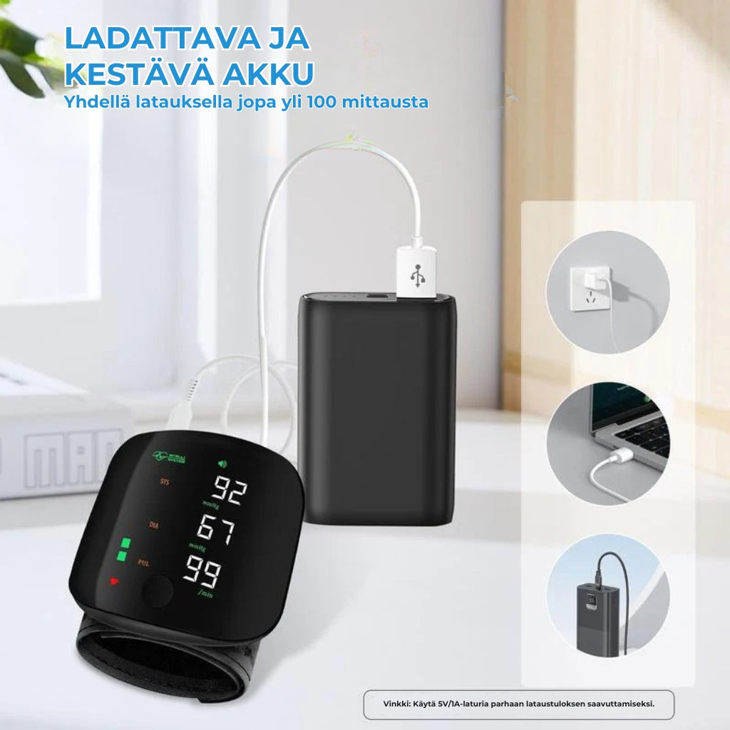 Rannemittarimme antaa nopeita ja luotettavia tuloksia uskomattoman tarkasti, mittaustarkkuuden ollessa ±3 mmHg.