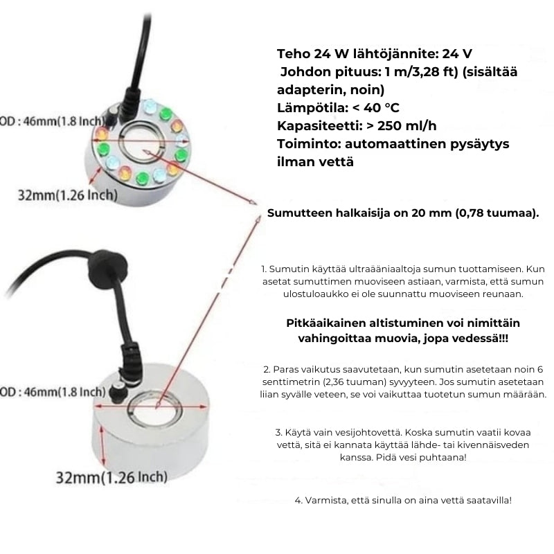 Ei vain esteettinen elämys! Sumutin auttaa myös kosteuttamaan kuivaa ilmaa ja poistamaan epämiellyttäviä hajuja vedestä. Täydellinen sisäkasveille, suihkulähteisiin, akvaarioihin, lintualtaille ja muihin vesielementteihin.