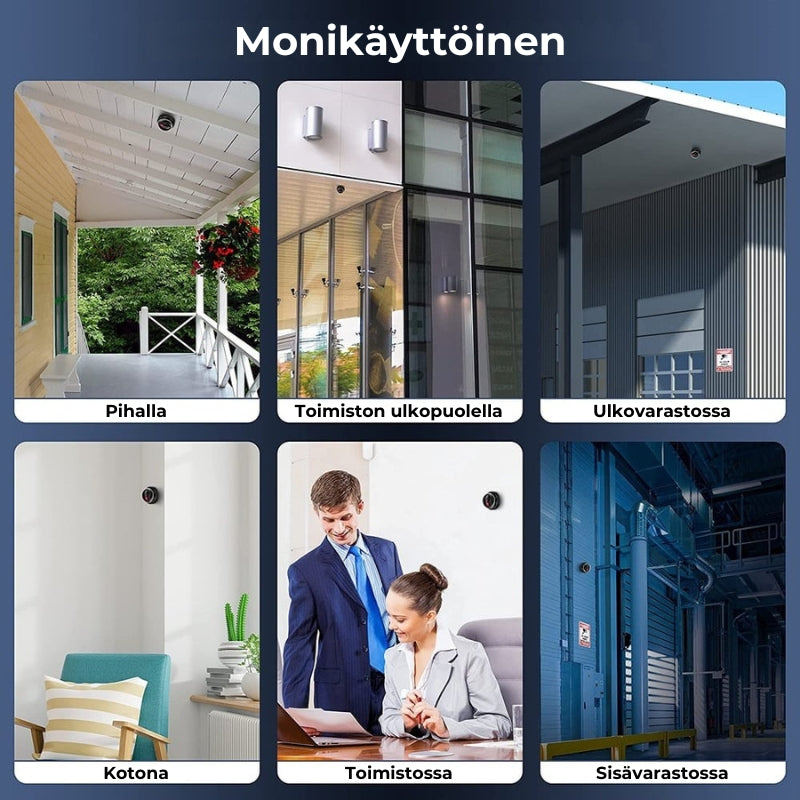 Et tarvitse työkaluja tai sähköasennuksia. Kameran asentaminen onnistuu hetkessä – kiinnitä se näkyvälle paikalle ruuveilla tai teipillä, ja halutessasi voit lisätä olemassa olevia kaapeleita tuomaan lisää realismia.