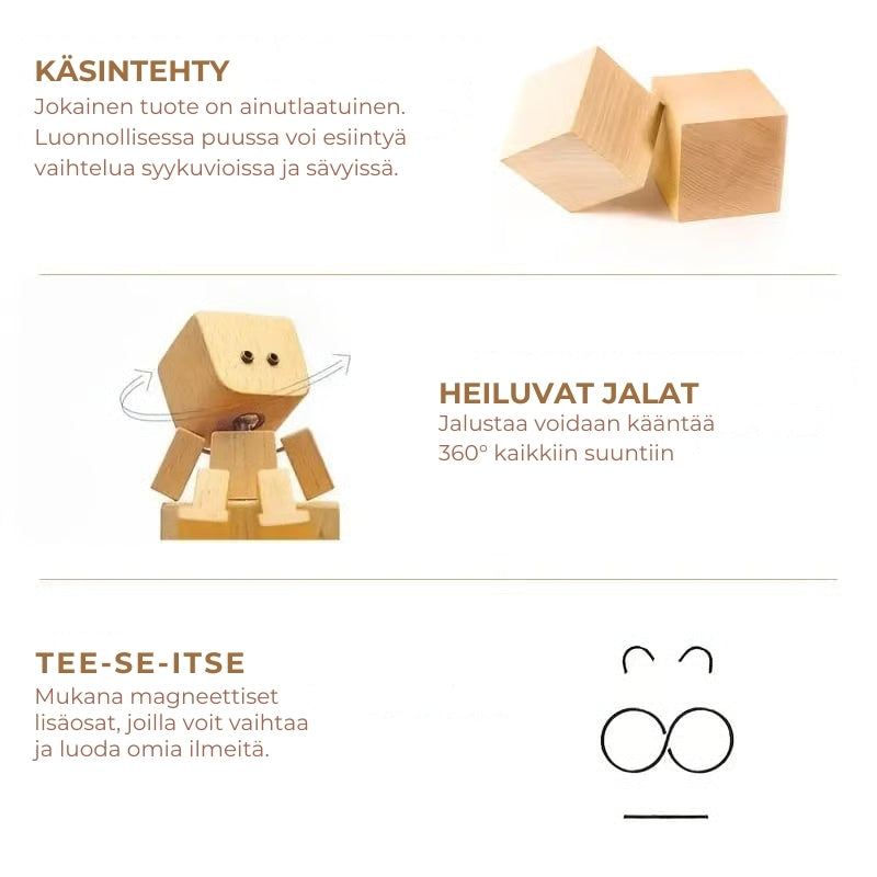 Luo nukelle omat ilmeet: Mukana tulevien lisävarusteiden ja ohjeiden avulla voit muokata hahmon kasvoille jopa 12 erilaista ilmettä. Koska jokainen nukke on käsintehty, sen ulkonäkö on aina täysin uniikki – ja lisäksi voit personoida sen mieleiseksesi.