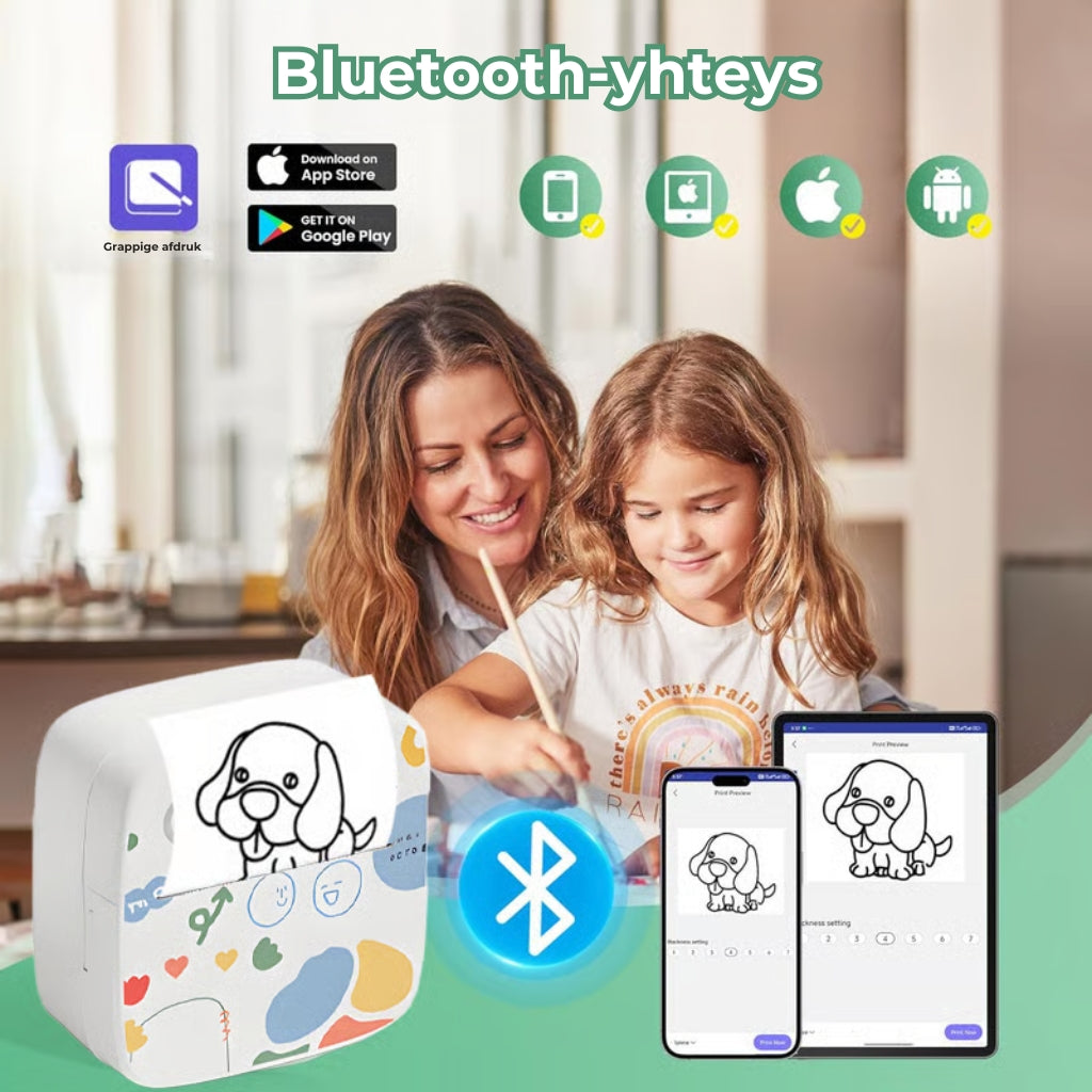 Tulosta missä ja milloin tahansa yhdistämällä tulostin älypuhelimeesi Bluetoothin kautta. Yhteensopiva sekä iOS- että Android-laitteiden kanssa: 1. Lataa FunnyPrint-sovellus. 2. Pidä virtapainiketta painettuna, kunnes merkkivalo vilkkuu. 3. Yhdistä AH-M2 Bluetoothin kautta ja aloita tulostaminen!